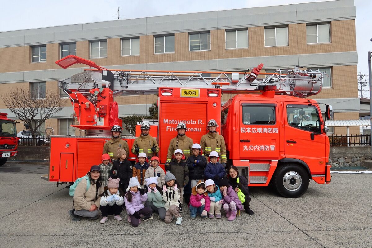 1月22日(木)、すみれ組のみんなで、丸の内消防署へ見学に出かけました。朝は雪が舞っていたものの、天気も回復し、無事に出かける事ができました!かっこいい消防署の皆さんが、もう待っていて下さっていました。