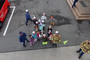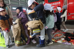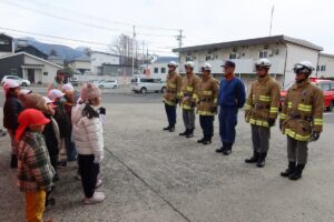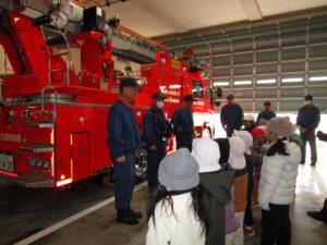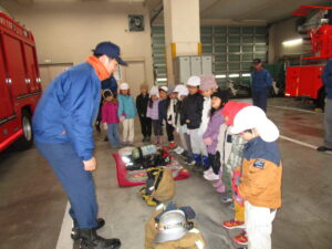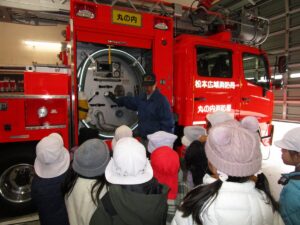 1月22日(木)、すみれ組のみんなで、丸の内消防署へ見学に出かけました。朝は雪が舞っていたものの、天気も回復し、無事に出かける事ができました!かっこいい消防署の皆さんが、もう待っていて下さっていました。