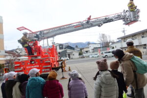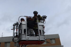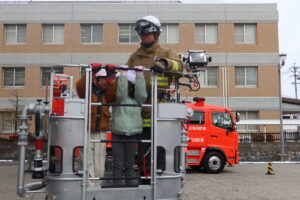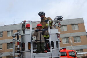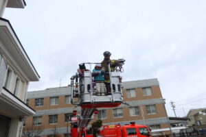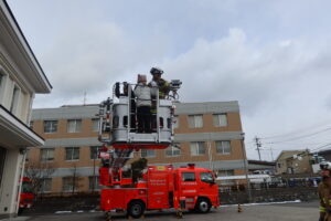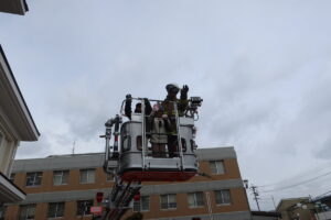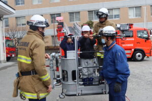 はしご車に乗せて頂くことになりました!何人もの消防士さんたちが、安全に気を付けながら準備を進めます。