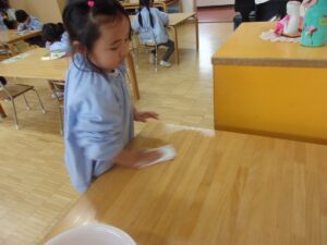 すみれさんと園のぞうきんがけができるように、ぞうきんしぼりをマスターしよう!