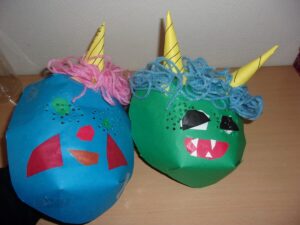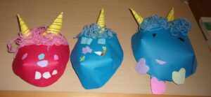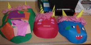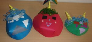 赤オニ、青オニ、緑オニ、何色のオニにするか決めて、顔の形も自分で描いて切りました。形ができたらツノや髪の毛をつけて、顔のパーツづくり!