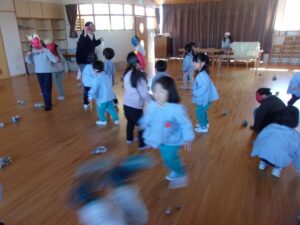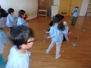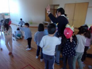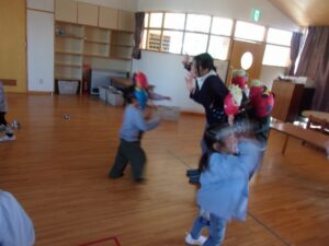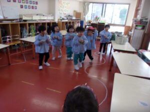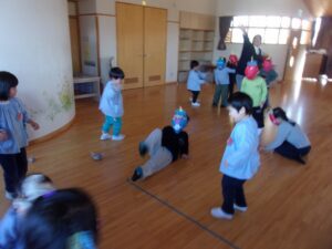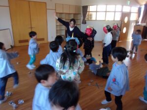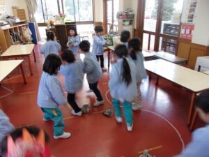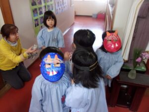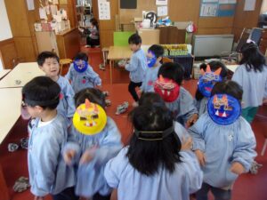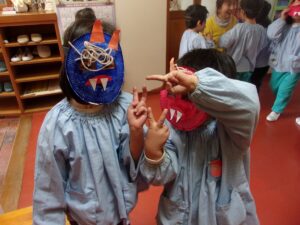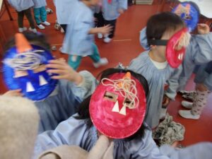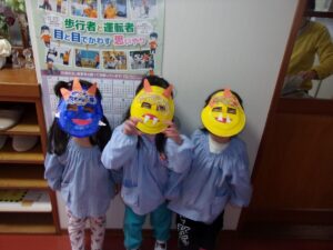 その後も、お家に持ち帰った鬼のお面を園につけてくる子もおり、まだまだ楽しんでいます。