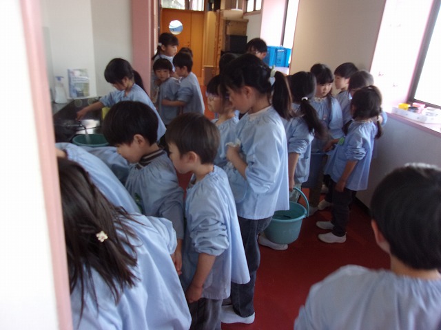 年中ゆり組では、春に年長すみれ組になるために、幼稚園をきれいにしてくれる年長さんからぞうきんがけを教えてもらいました。
