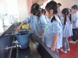 まずはバケツに水をくむところから。すみれさんのことをよく見て覚えています。
