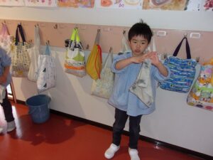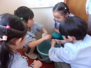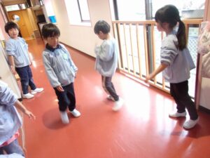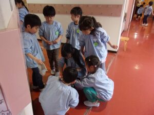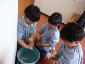 年中ゆり組では、春に年長すみれ組になるために、幼稚園をきれいにしてくれる年長さんからぞうきんがけを教えてもらいました。