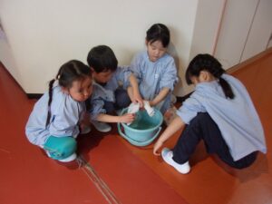 ぞうきんがけが終わったら、ぞうきんを洗ってバケツの水を流すよ。