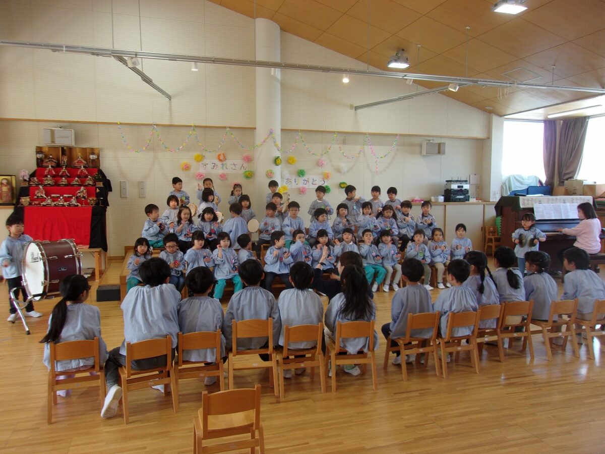 3月5日、もうすぐ幼稚園を卒園する年長すみれ組さんへ、感謝の気持ちを伝える「ありがとう会」が開かれました。この日のために、つぼみ組、ばら組、ゆり組が力を合わせて準備をしてきました。