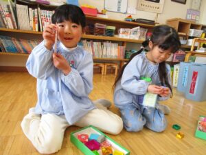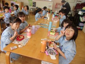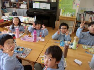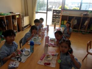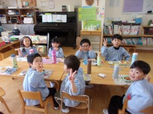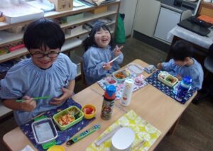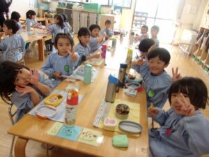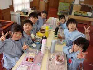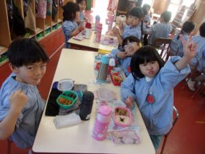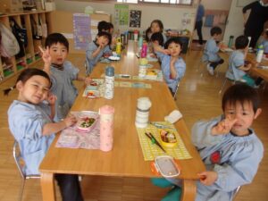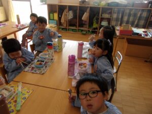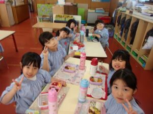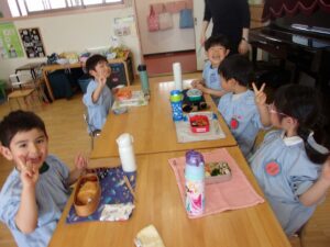 そしてこの日は今年度最後のお弁当の日。今日はいろいろなお部屋でお友だちと一緒に食べました。