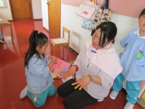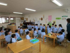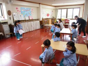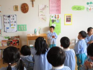 毎日の「おとうばん」も順番におこなっています。お祈りの時に前にでたり、皆の名前呼びをしたり…。