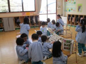 絵本や図鑑を見ることも好き♪一人でじっくり見たり、友だちと図鑑を見て盛り上がったり…。担任が毎日読み聞かせをする絵本も、本当によく見ています。