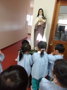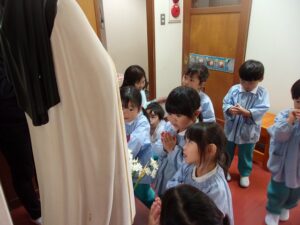 ばら組の部屋の前にいらっしゃる「テレジアさま」の前でお祈り。今日も元気に過ごすことができますように。