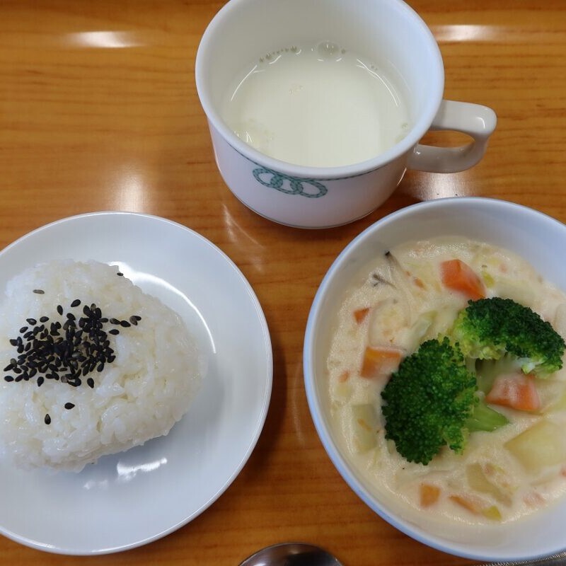 今日の献立 「おにぎり ホワイトシチュー 牛乳」 栄養士さんからのコメント…
