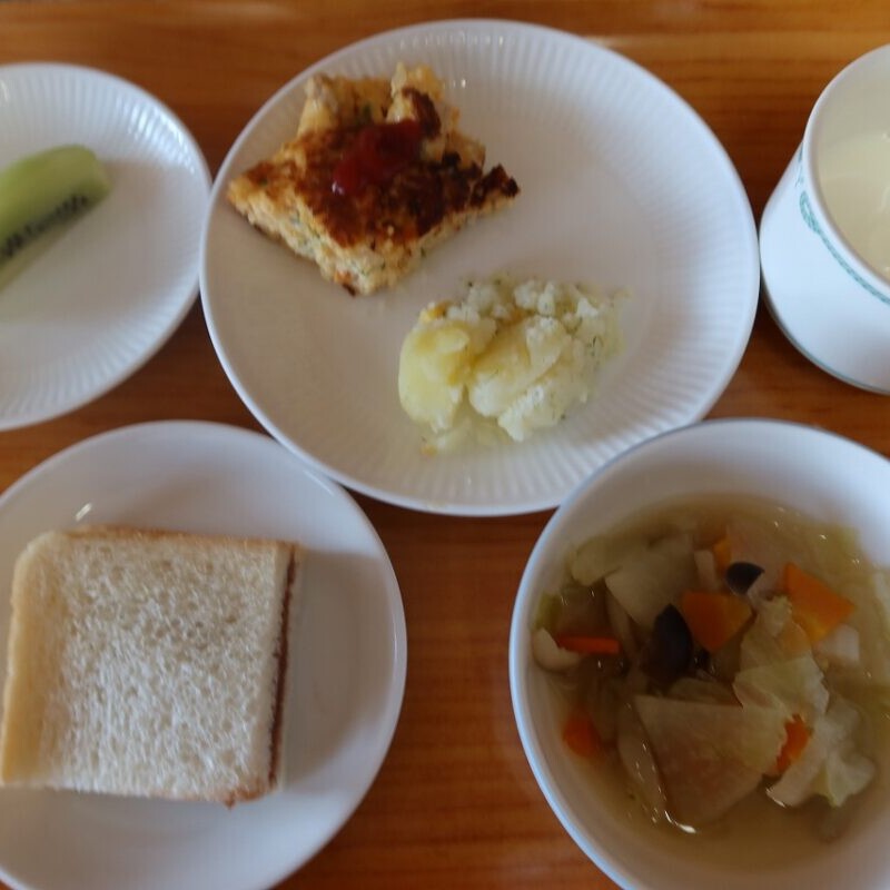 今日の献立 「ココアサンド・ミートオムレツ・のりじゃがコーン・野菜スープ・キウイ・牛乳」…