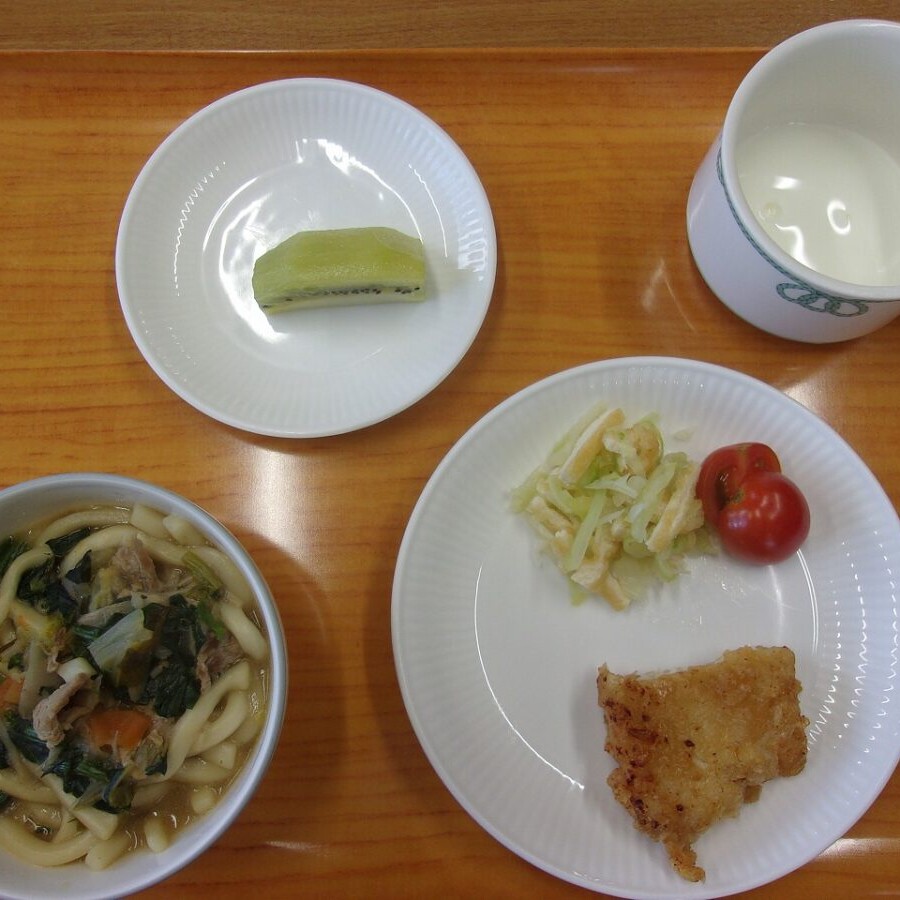 今日の献立 「煮込みうどん 魚の唐揚げ きゃべつと油揚げの甘酢和え キウイ 牛乳」…