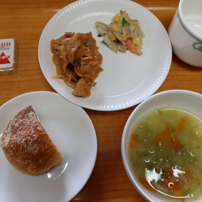今日の献立 「揚げパン・ポークチャップ・ごぼうサラダ・野菜スープ・チーズ  牛乳」…