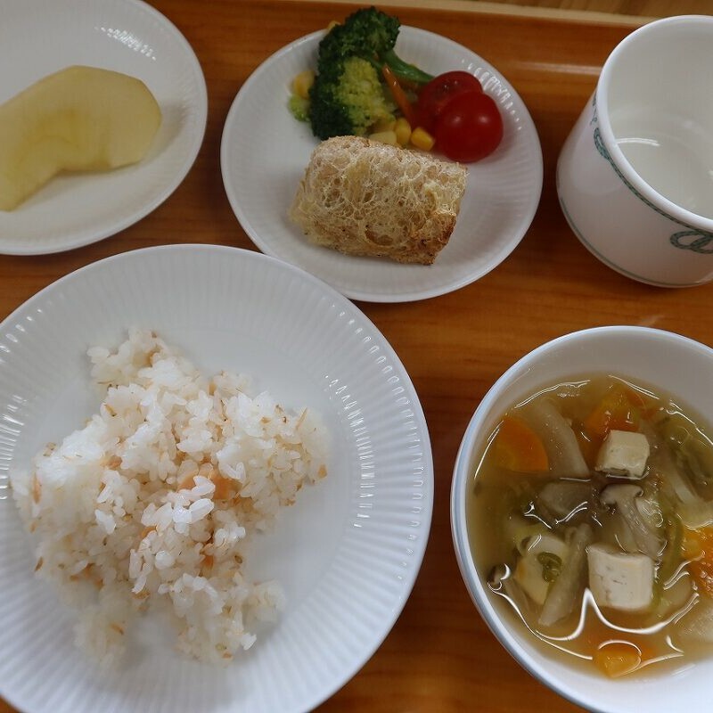 今日の献立 「鮭の混ぜご飯 コンコンコロッケ ブロッコリーサラダ 大根のすまし汁 リンゴ 牛乳」…