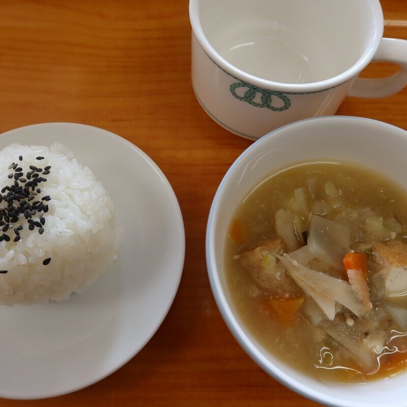 今日の献立 「おにぎり・厚揚げと根菜の味噌汁・牛乳」 栄養士さんからのコメント…
