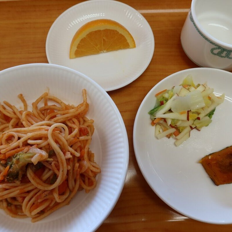 今日の献立 「スパゲティナポリタン かぼしゃの素揚げ 白菜サラダ オレンジ 牛乳」…