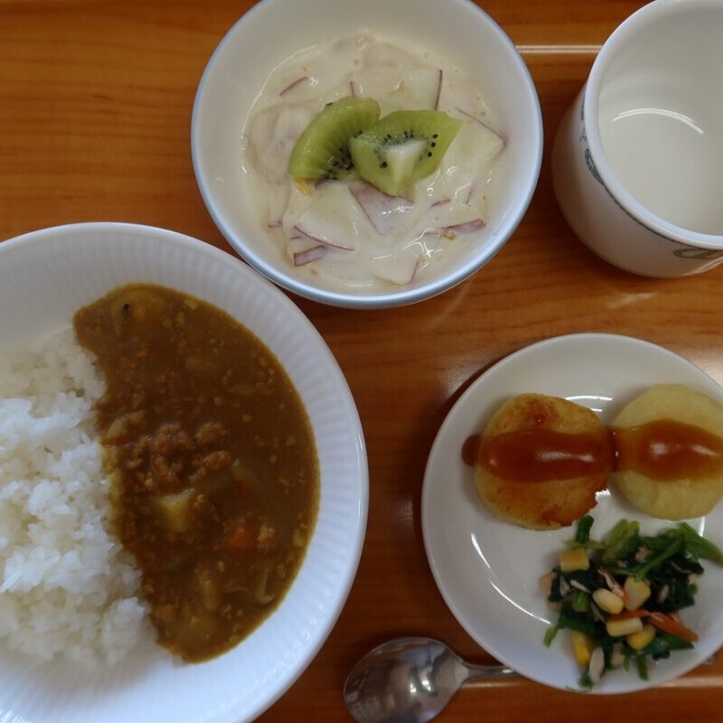 今日の献立 「カレーライス いももち ほうれん草とツナコーンサラダ フルーツのヨーグルト和え…