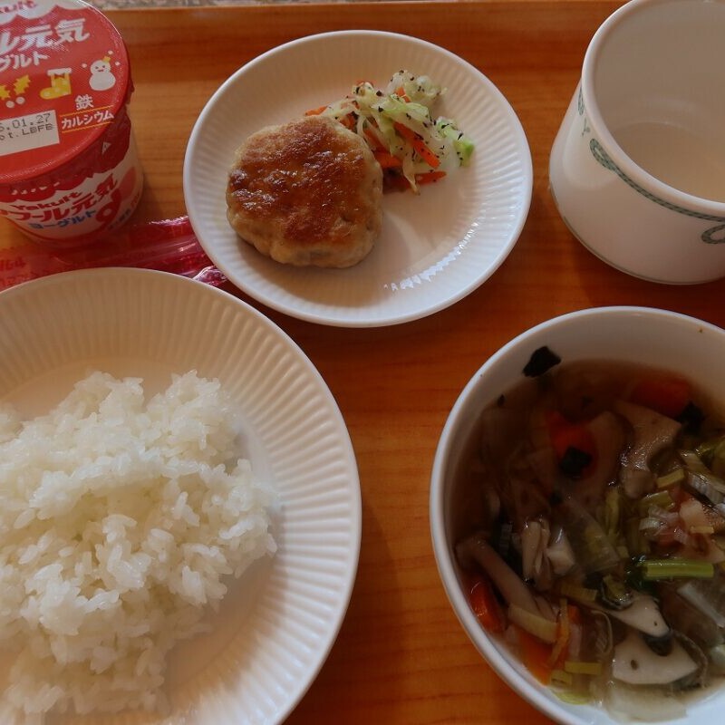 今日の献立 「ごはん・和風豆腐ハンバーグ・きゃべつのゆかり和え・根菜汁・ヨーグルト・牛乳」…