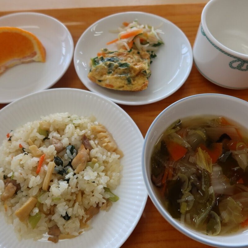 今日の献立 「中華風混ぜご飯 ニラ玉 春雨サラダ わかめスープ ポンカン 牛乳」…
