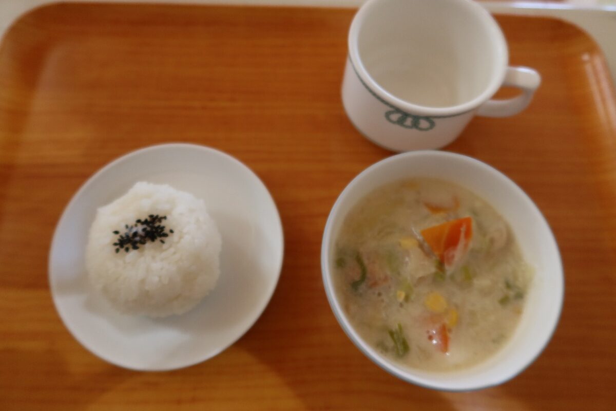 「おにぎり 鶏団子の豆乳スープ 牛乳」