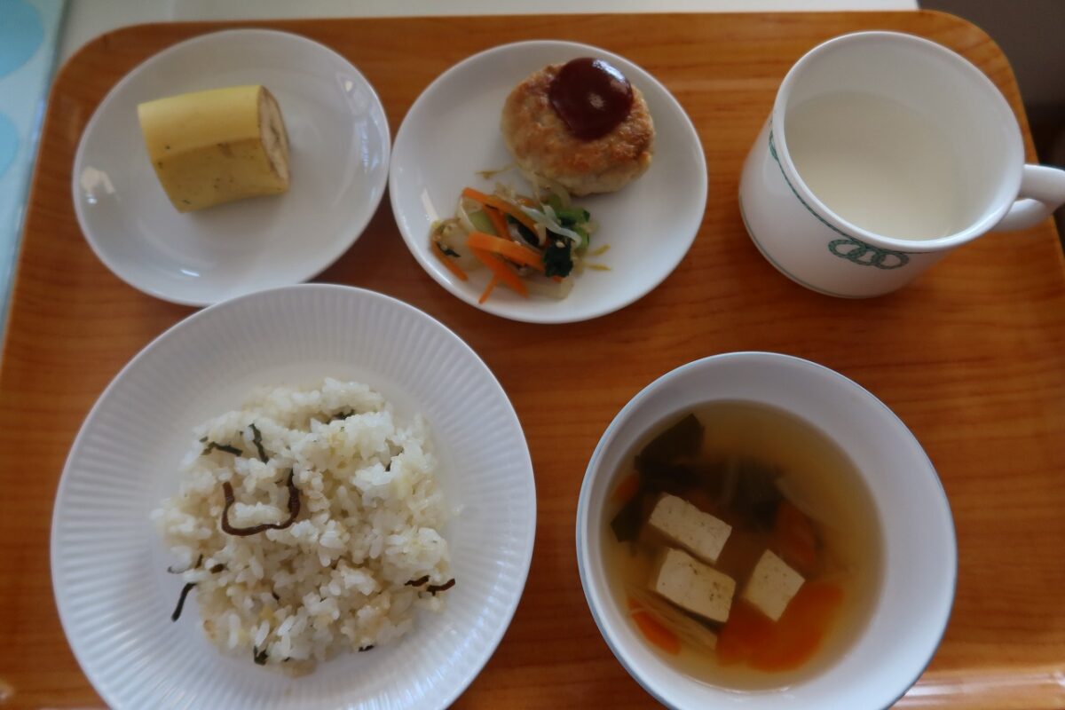 「チーズこんぶご飯 豆腐ハンバーグ 小松菜のナムル すまし汁 バナナ 牛乳」
