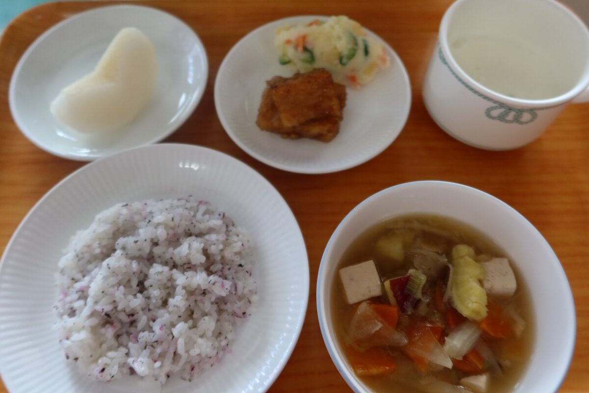 「ゆかりごはん 厚揚げの照り焼き ポテトサラダ さつまいものけんちん汁 梨 牛乳」
