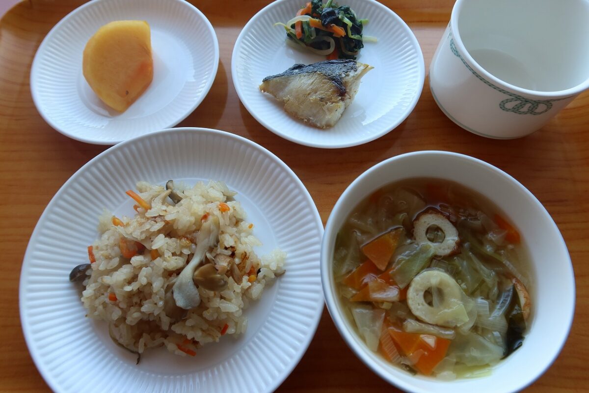 主食は『きのこの炊き込みご飯』です。しめじ、しいたけ、まいたけを入れてお醤油と酒で炊き込みました。