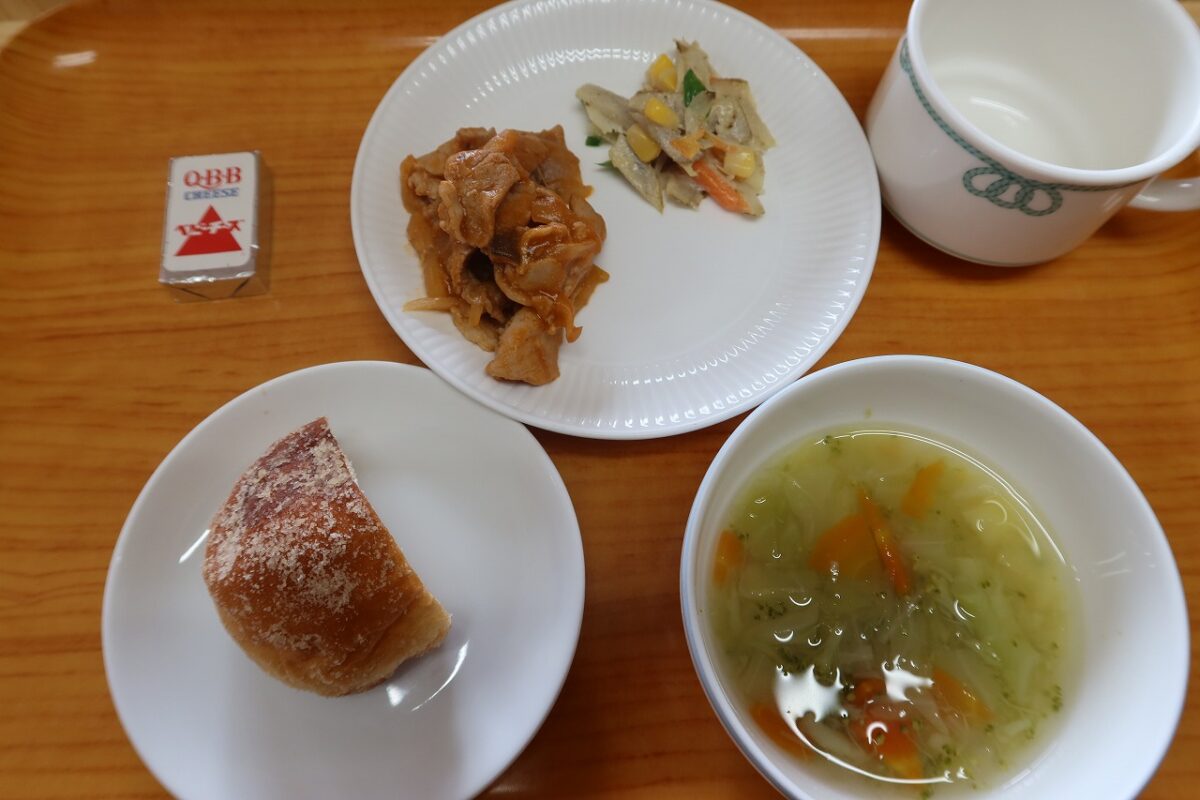 「揚げパン・ポークチャップ・ごぼうサラダ・野菜スープ・チーズ 牛乳」