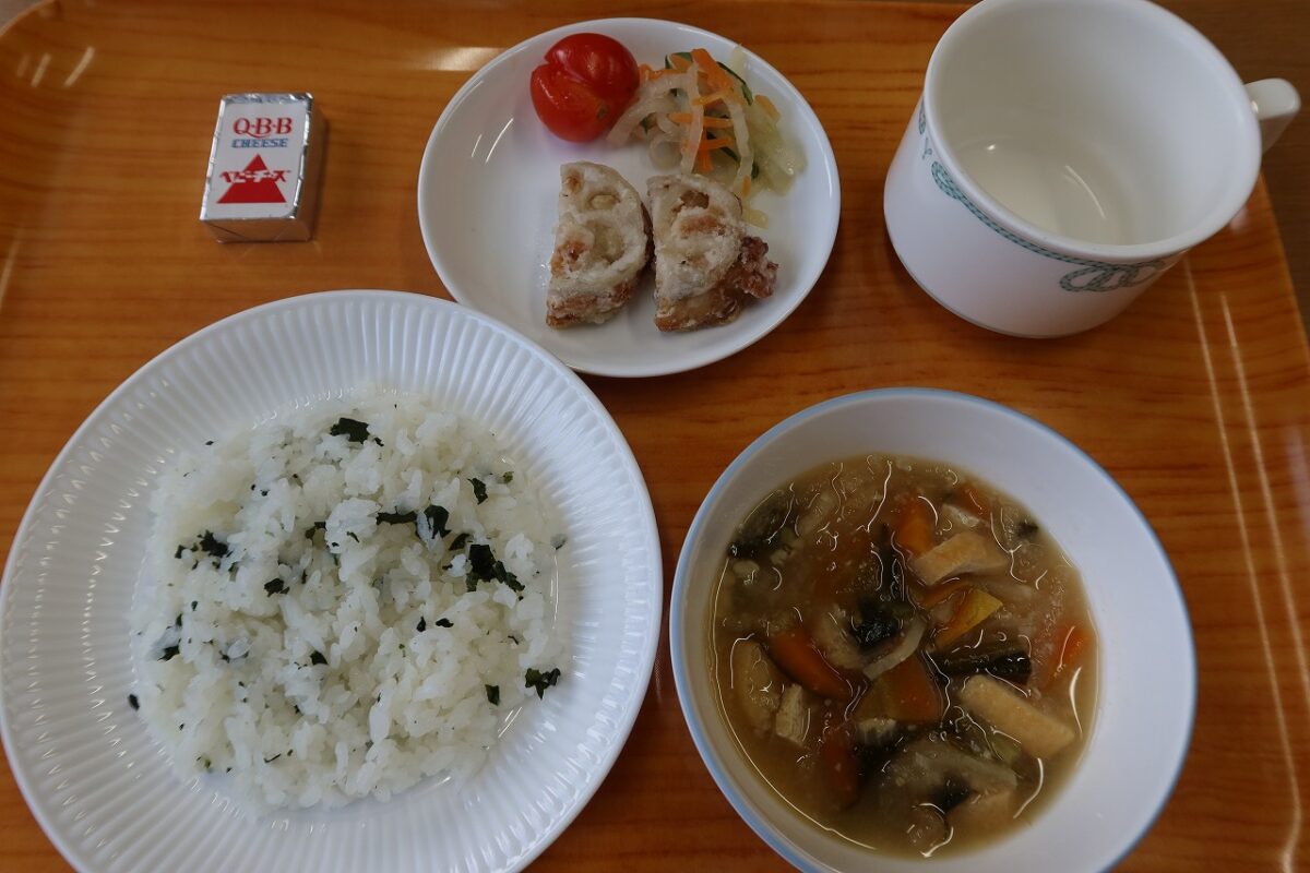 「わかめごはん レンコンのはさみ揚げ 大根とツナの和え物 切り干し大根の味噌汁 チーズ 牛乳」