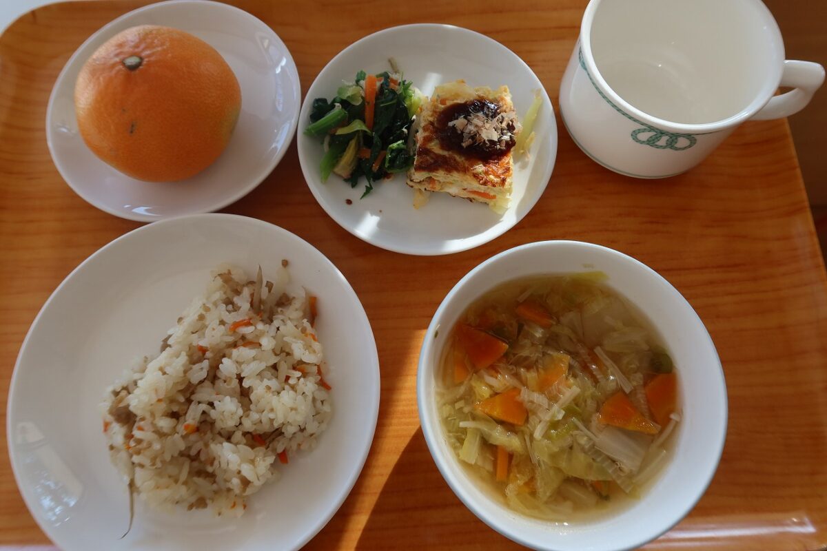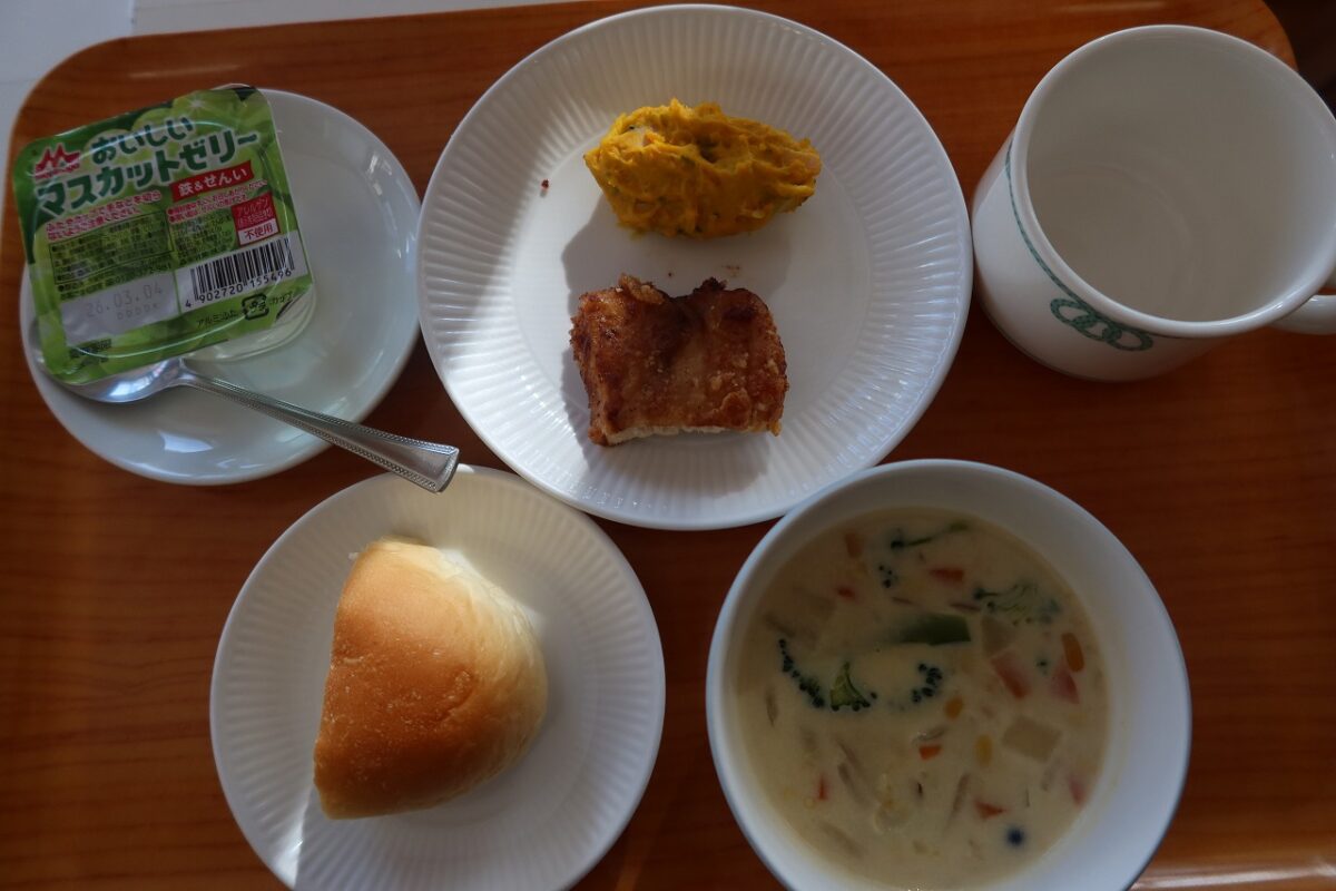 「ロールパン・魚の唐揚げ・かぼちゃサラダ・具だくさんコーンスープ・ゼリー・牛乳」