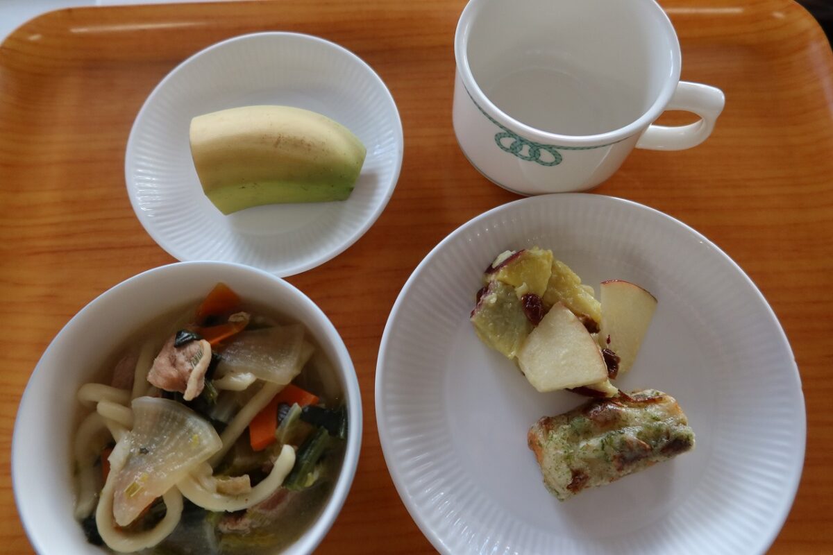 「煮込みうどん ちくわの磯辺あげ さつまいもサラダ バナナ 牛乳」