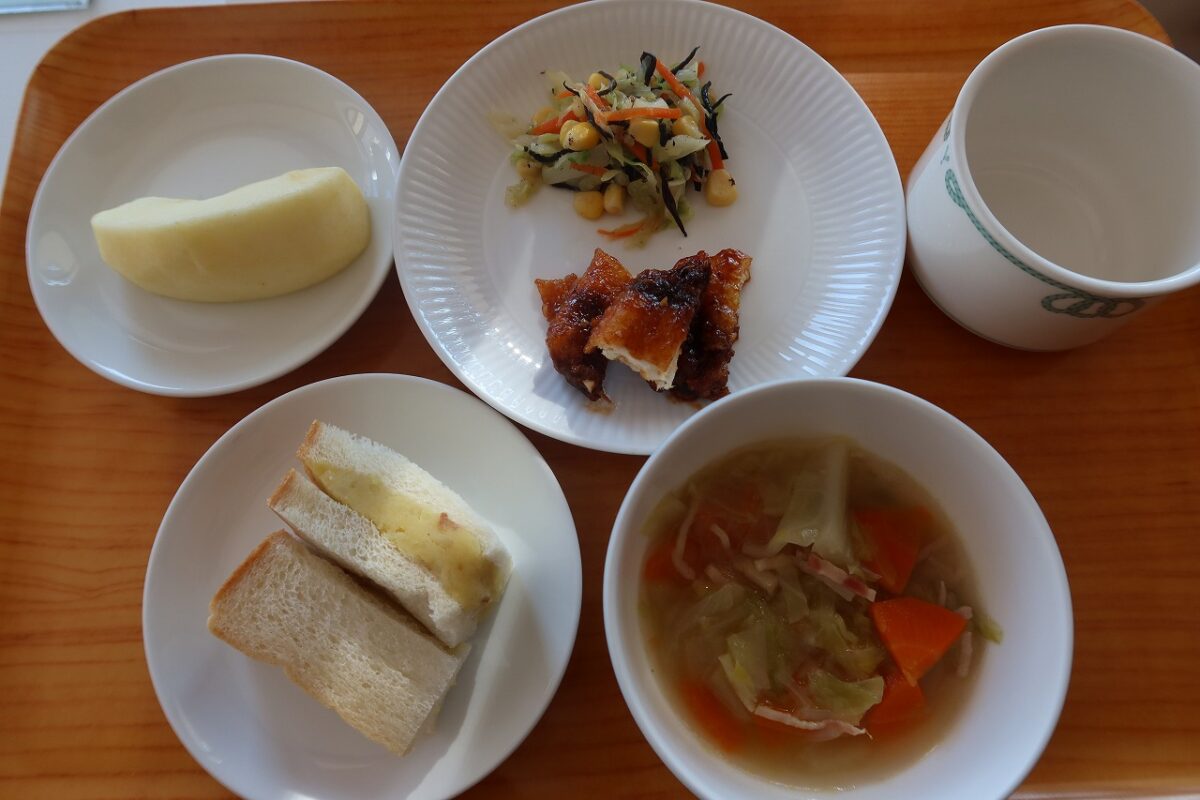 「スイートポテトサンド・カジキのバーベキューソース・ひじきサラダ・白菜スープ・りんご・牛乳」