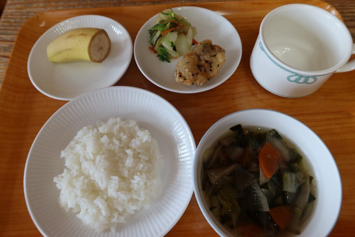 「ごはん 魚のごま風味揚げ 昆布和え 根菜のすまし汁 バナナ 牛乳」
