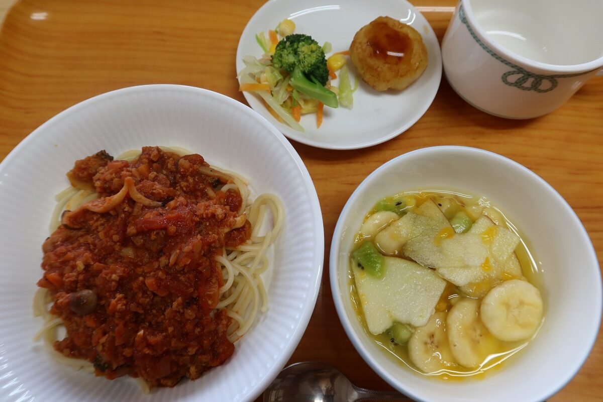 「ミートソーススパゲティ・みたらし芋もち・フレンチサラダ・フルーツポンチ・牛乳」