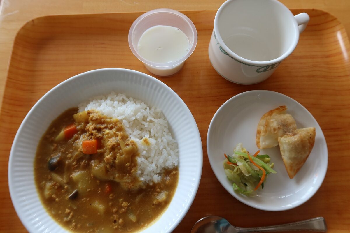 主食は『カレーライス』です。豚ひき肉、玉ねぎ、人参、じゃが芋、しめじを入れてカレーを作りました。